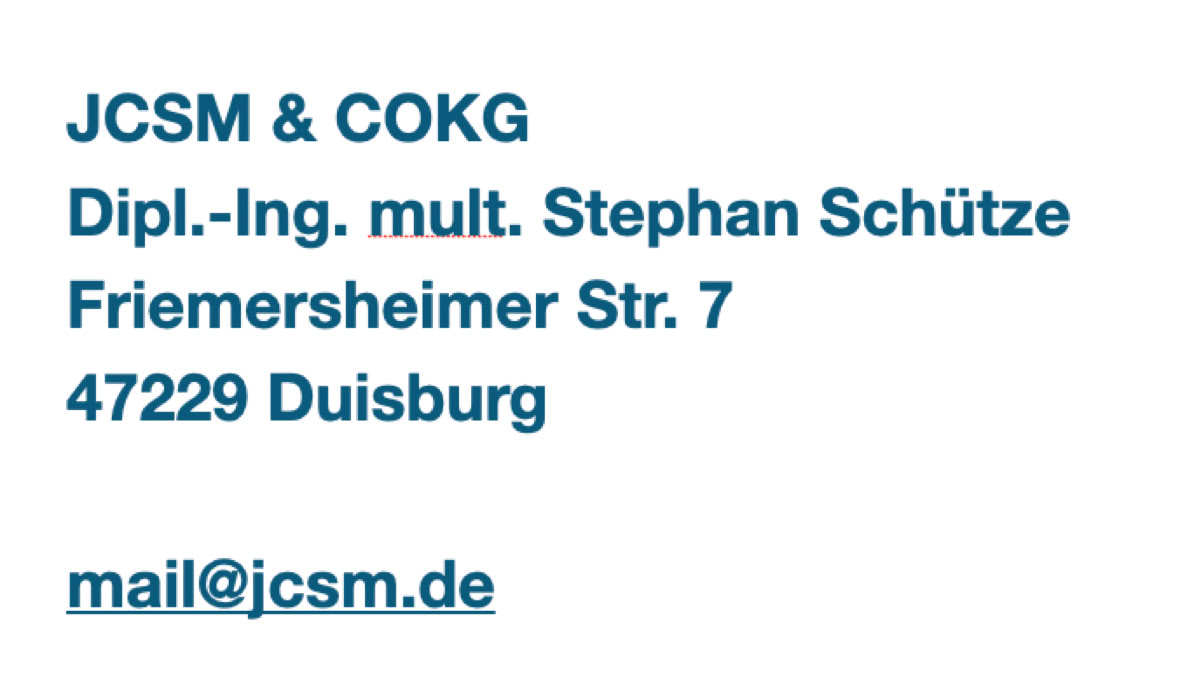Der Nutzung von im Rahmen der Impressumspflicht veröffentlichten Kontaktdaten zur Übersendung von nicht ausdrücklich angeforderter Werbung und Informationsmaterialien wird hiermit widersprochen. Die Betreiber der Seiten behalten sich ausdrücklich rechtliche Schritte im Falle der unverlangten Zusendung von Werbeinformationen, etwa durch Spam-E-Mails, vor.